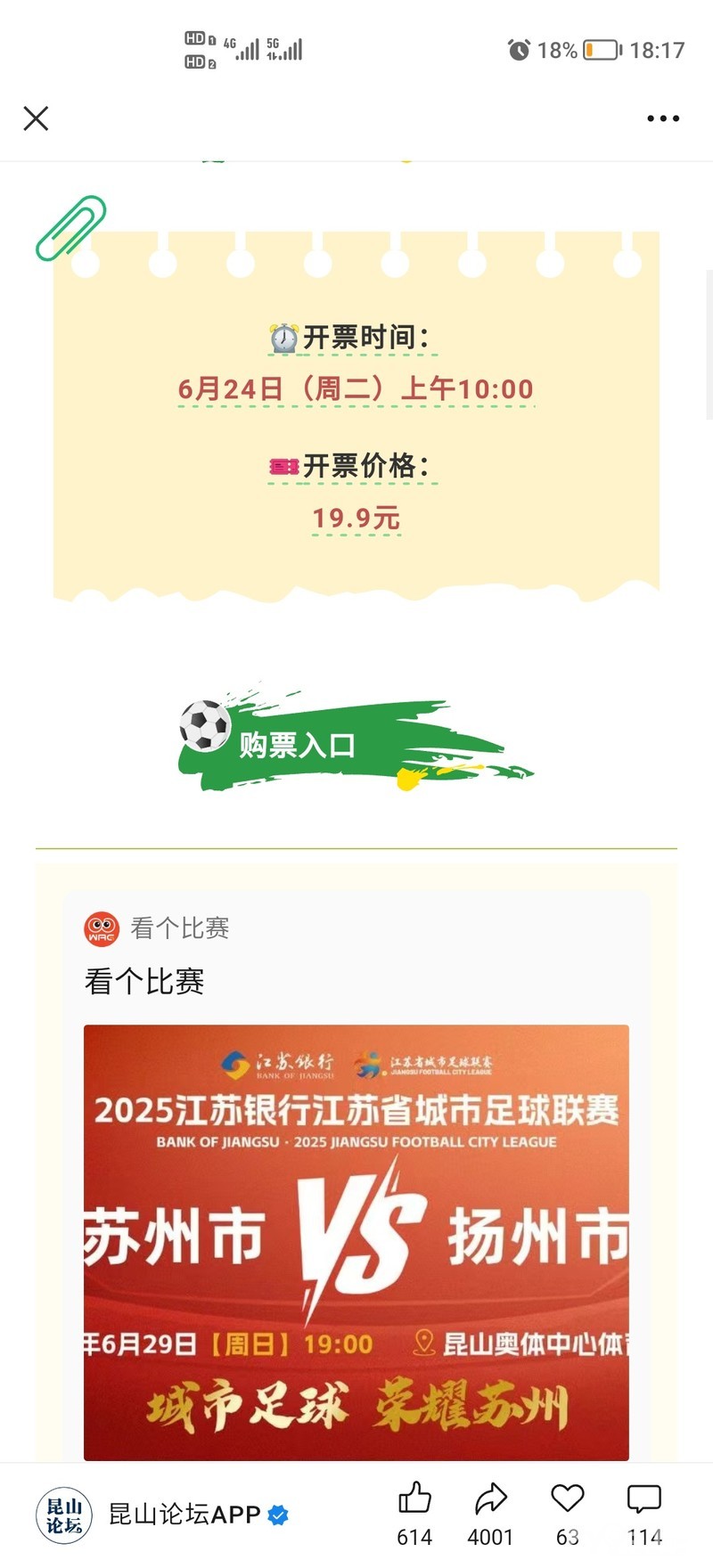 苏州主场对扬州,19.9元了