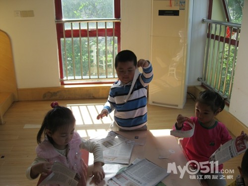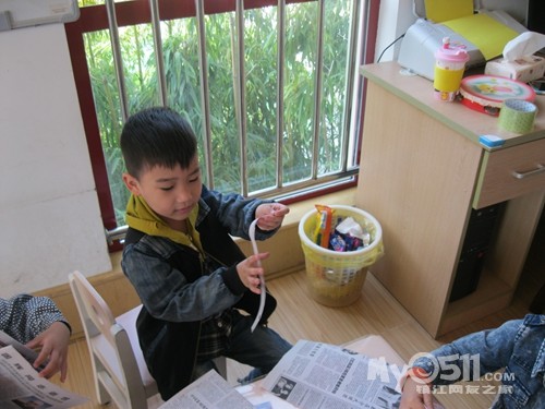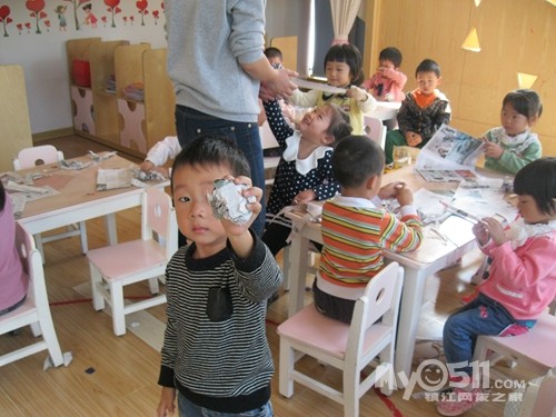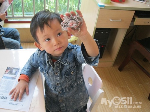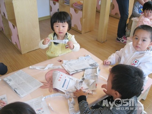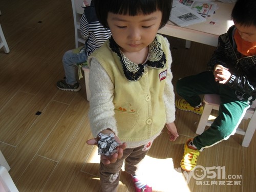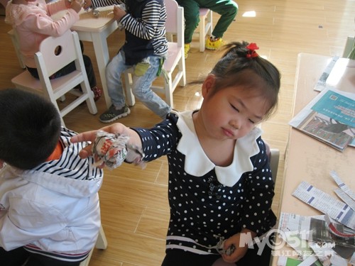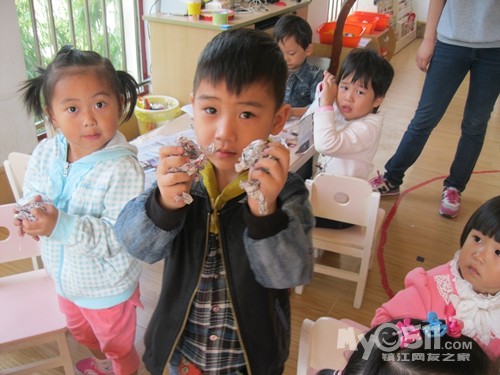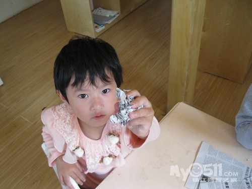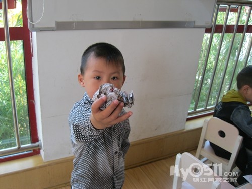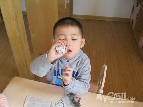 下午点心是黑米粥,我坐在那些吃饭慢的小朋友面前看他们吃,沈峻尧可逗了,左手拿勺子吃几口,累了换右手拿勺子,左右开弓,意识到脸上有米粒了就用手撸进嘴,我教他用勺子:“来,这样用勺子刮、刮、刮,一刮就刮进去了。”大概我的动作比较夸张,他边刮边呵呵地傻笑。沈宝宝傻笑的样子很可爱,可他也会傻哭,吃完饭同坐褚佳玮说他:“你不会说话。”沈宝宝说:“我会说话。”褚宝宝再一句:“你不会说话。”沈宝宝回一句:“我会说话。”因为两人的对话很有趣,我悄悄地踱到他们的身后,就见两人如此反复,几个来回后,钟灵毓也加进来了,钟宝宝有点口齿不清:“你不贵说挂。”这回好了,二对一,渐渐地沈宝宝声音大起来,还加上手的动作,碰碰褚宝宝的手,摸摸钟宝宝的脖子,我心想:“真是个老实孩子,搁别人早就发生抓人现象了。”就这么,三个人:“你不会说话。”“你不贵说挂”“我会说话”,哈哈,最后,沈宝宝脸色开始变了,开始着急的哭了:“哇哇,我害怕老师。”得,不知什么时候老师成了替罪羊了!