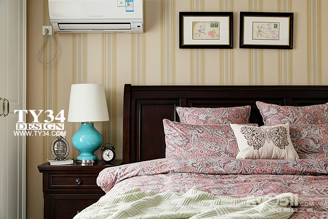 本来主卧室挺大的,但是这套房型没有飘窗,女主角非要在主卧室里面人为的制造一个飘窗出来,于是,主卧室一下子缩小了,好在飘窗两头的墙做成了储物柜的形式,空间得以利用。这些都不是难题,困难的是原先的空调机位放置空调碍事了,空调室内机如果离柜门太近的话柜门会打不开,而且原先的空调孔也无法利用,对面的墙面为了做造型也放不了空调。最后只好直接从空调后面打孔出去,意想不到的是反而更加美观,看不到空调的风管了。不过如果是使用中央空调的话这些问题都不会有,所以中央空调其实是非常便利室内设计的一种电器。飘窗设计我们很传统的使用了大理石台面,但是上面我们制作了软垫。