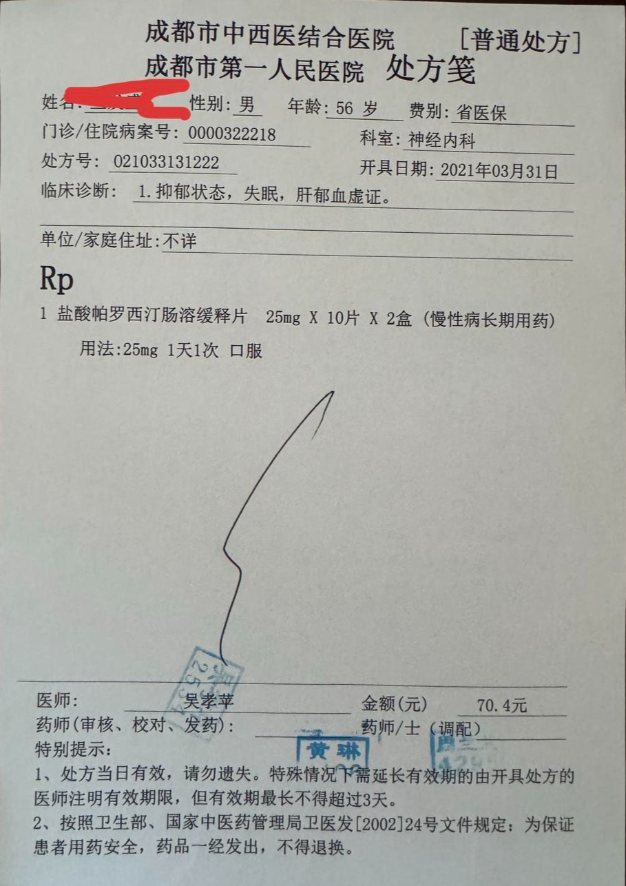 喻女士介绍,张先生于2021年3月曾在成都市第一人民医院诊断为“抑郁状态、失眠,肝郁血虚证”,多年来一直在服药。