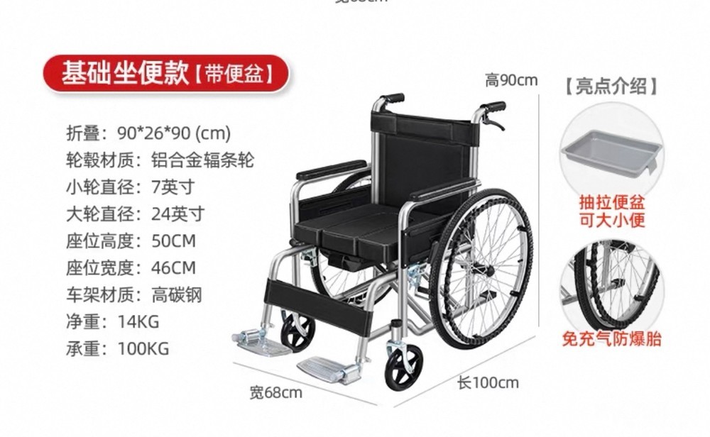 可折叠轮椅,带坐便功能,铝合金车架,高碳钢材质,承重100公斤。尺寸:长100cm,宽68cm,高90cm。带靠背护手,坐垫舒适,实心轮胎免充气,折叠方便。买来只用过几次,同城可送货上门,200元。有意联系15358581540