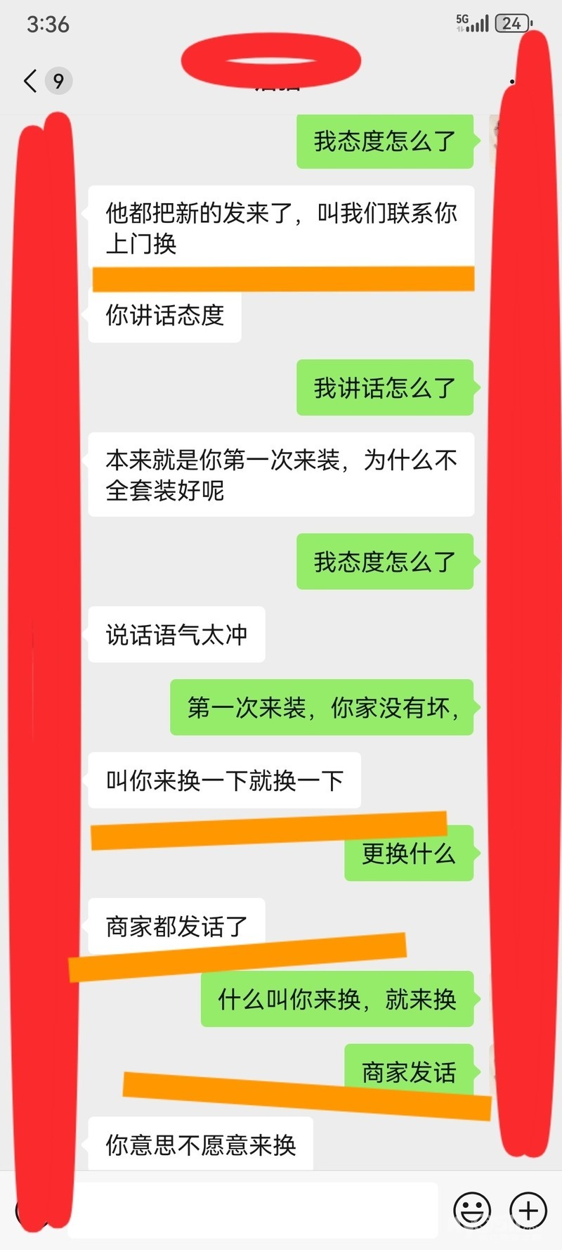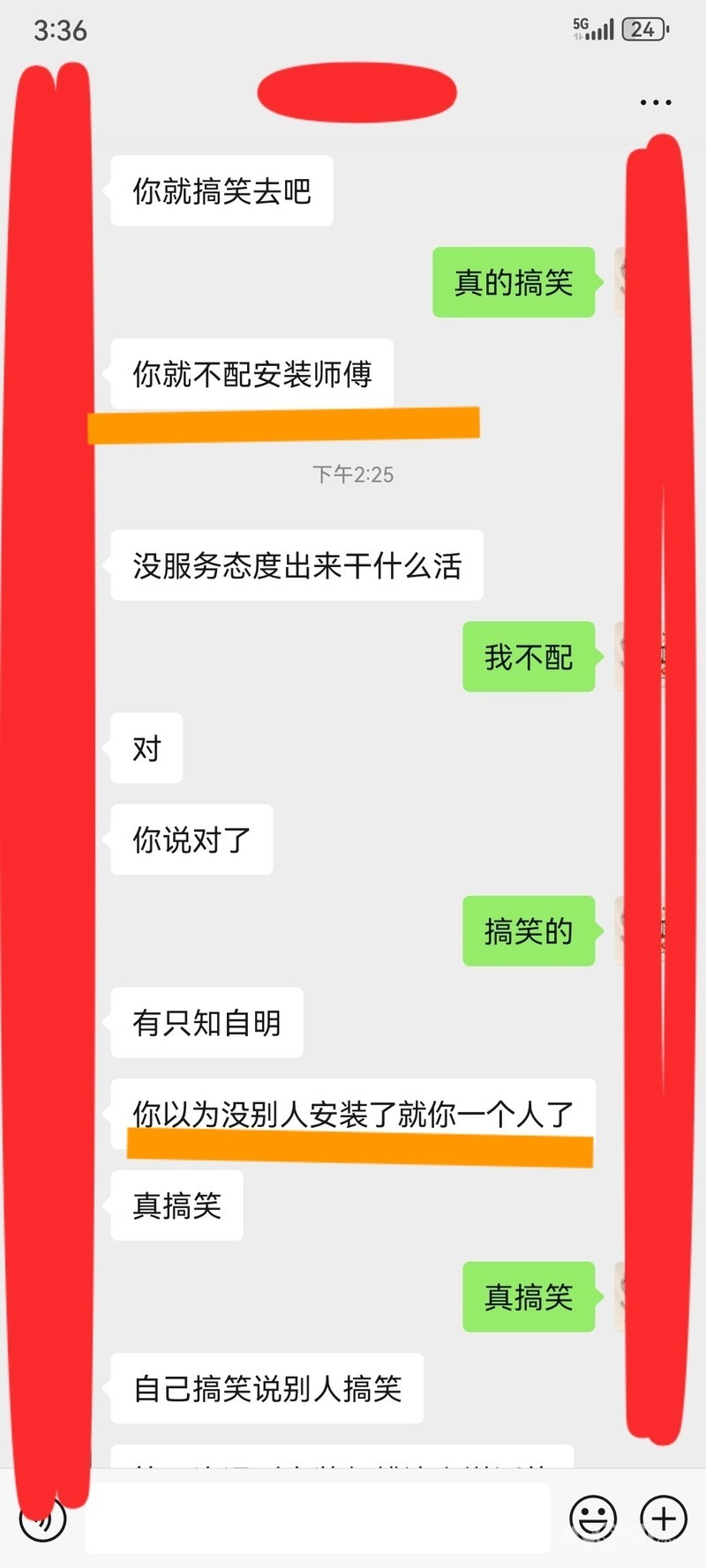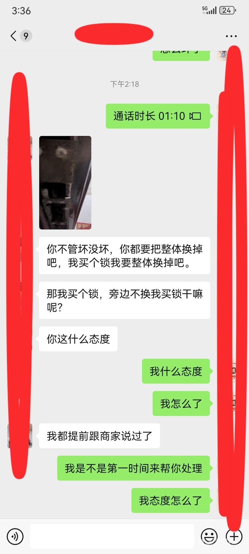 今天下午两点多,我接到一个电话!电话里说是我之前安装指纹锁的一个客户,说门框坏了,我当时没有装,商家让他联系我的,我知道侧边框估计出问题,但是我没有接到商家的售后维修订单,但是我没有拒绝,我让他加我微信,把坏的拍给我看看!一般我们维修锁都是加客户微信,和客户视频,确认哪里坏了,然后让客户和商家说下更换什么配件,然后商家把配件快递给我们,或者客户,等配件到了,我们上门更换,没一分钟,加我微信了,发了一张图片,侧边框,我看不出哪里有问题,我就问怎么坏了,然后我就视频过去,我让他对准侧边框,我说怎么坏了,哪里有问题,对方一个男的,说响了有声音,然后关门,门慌动,说我家新买的,为什么不安装,我说商家和你家一模一样,而且当时是没有慌动,我就没有换,最后我就说我查下单子,就把视频挂了,查单子,我看了半天,没有这个订单,我刚准备告诉他,商家没有派单给我,一般我们都是安装售后质保三个月,只要安装问题,三个月之内都是质保的,这时候客户发来信息,说不管坏没有,都要把他家侧边框给安装了,不然买新锁干什么,说我什么态度,重头到尾,我没有说几句话,我态度有问题,他提前和商家说了,商家把新的侧边框都发过来,让我联系你的,我工单里面就没有他这个单子!说我讲话态度不好,第一次来,就没有装全套,当时调试都是没有问题的,门也不慌,侧边框也没有问题,而且和商家发的一样,为什么要换了,侧边在更换的前提是门慌动,与商家锁体不匹配的情况下,才需要更换,何况一模一样的,调试过程中,没有任何问题,说我说话语气不好,我怎么不好,我是不处理了还是怎么,我在没有订单的情况下,我让你加微信,第一时间给你看问题,我就说了一句怎么坏了,有问题吗,我不应该问下怎么坏了,她来句叫你来换你就来换,我在没有接到通知,我想问下,谁会给你去换!真的,我火大了,说我什么态度,商家发话了,让你来,你就来!说我不配做安装师傅,我不配,我让你家我微信干什么,我直接不接单就是了,突然打电话给我,我地址拒绝,而且你已经收到商家快递了,说明你早就报修了,商家应该快递过程中就让我联系你了,我都没有收到消息,大家是不是上门安装售后,在快递过程中,就接到电话,预约安装了,你都拿到快递了,我都没有接到单子,说我态度不好,口气冲!我重头到尾就是视频看侧边框说了几句话,就最后我说查下单子,把视频挂了!我口气冲!最后我火了,说花几百块钱就想当大爷,疯了,打电话过来,要打我,在电话里都要发疯了!我真的无语的!都是什么人啊,是我格局小了吗?我正常售后,走流程!我真的不知道,我哪里说话冲!难道我不应该问一句,怎么坏了,难道你一个电话我必须要过去换!
